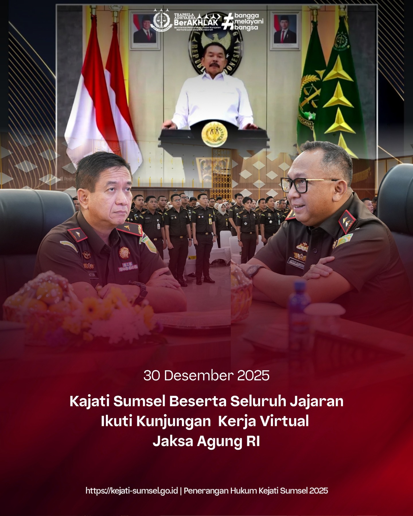 KAJATI SUMSEL – Palembang, Selasa 30 Desember 2025, Kepala Kejaksaan Tinggi Sumatera Selatan Bapak Dr. Ketut Sumedana didampingi Wakil Kepala Kejaksaan Tinggi Sumatera Selatan, Para Asisten, Kabag TU, Koordinator, Para Pejabat Eselon IV dan I juga seluruh pegawai pada Kejaksaan Tinggi Sumatera Selatan mengikuti pelaksanaan Kunjungan Virtual Jaksa Agung Republik Indonesia yang dilaksanakan dalam rangka konsolidasi dan peningkatan kinerja.