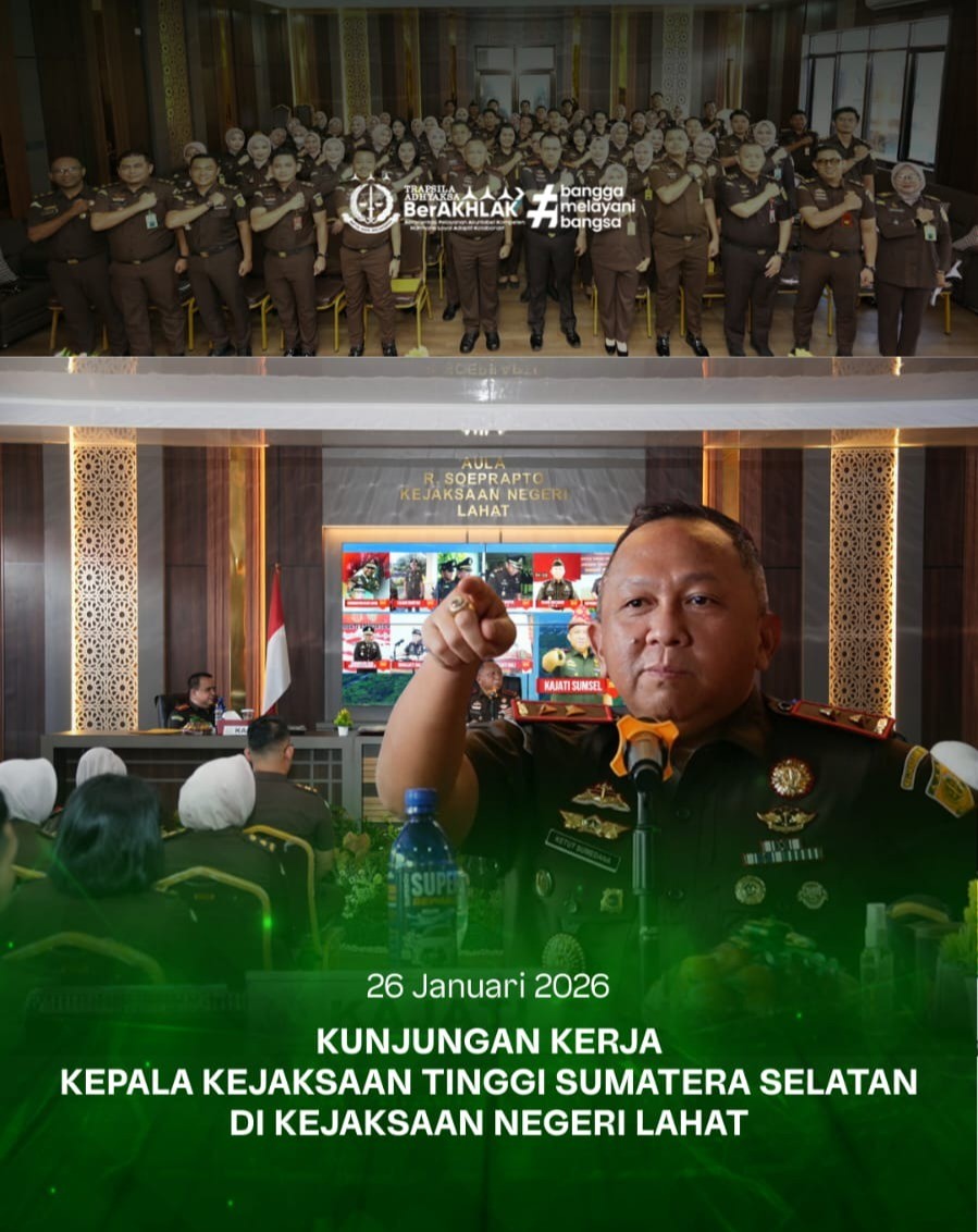Senin tanggal 26 Januari 2026, Kajati Sumsel Dr. Ketut Sumedana didampingi Kabag TU dan Kasi Penkum beserta rombongan melakukan Kunjungan Kerja di kantor Kejari Lahat. Kunjungan kerja ini dalam rangka monitoring dan evaluasi terhadap jajaran di Kejari Lahat dalam segi kualitas kinerja, inovasi dan kualitas pelayanan bagi masyarakat.