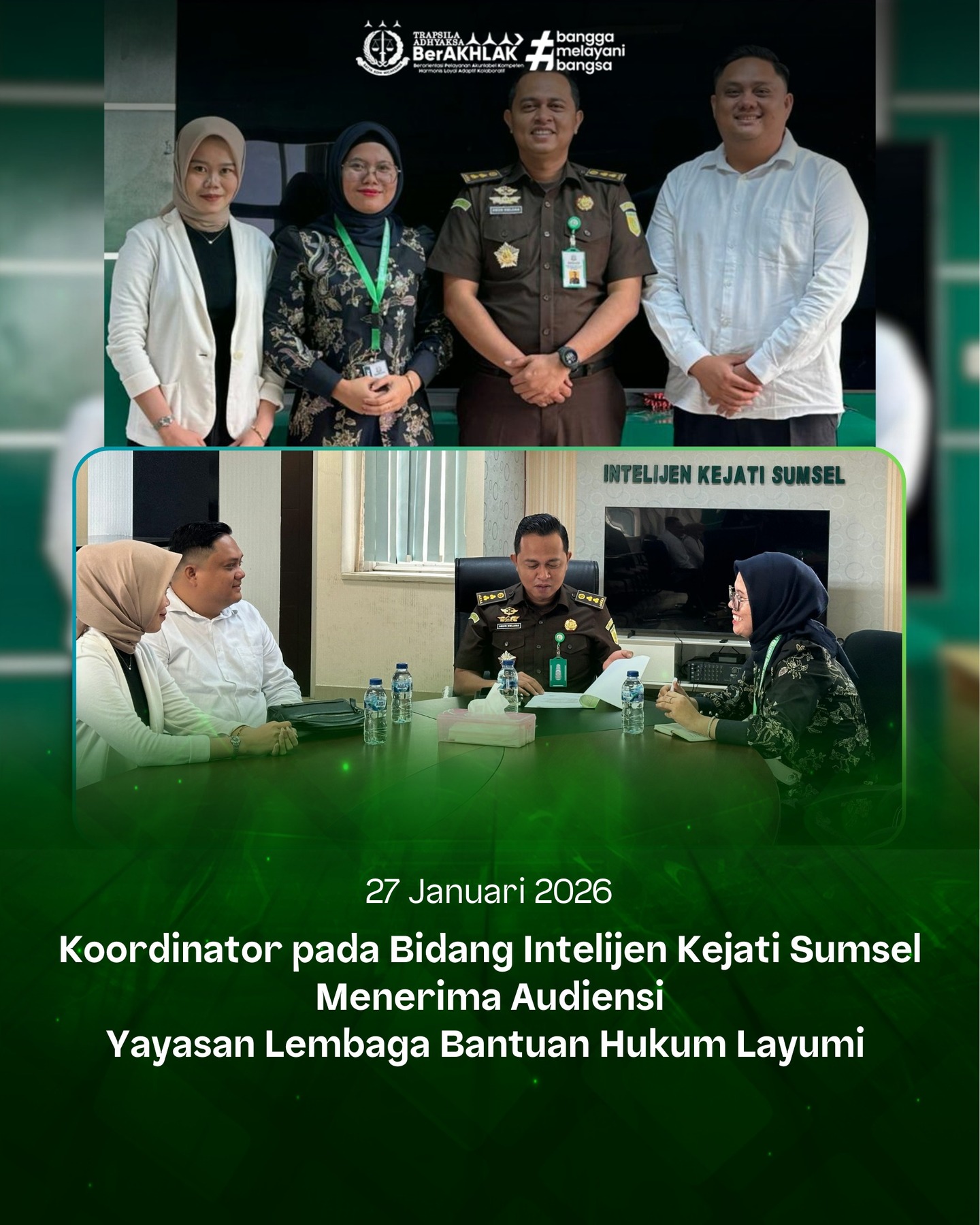 KEJATI SUMSEL - Palembang, Selasa 27 Januari 2026, Koordinator pada Bidang Intelijen Kejaksaan Tinggi Sumatera Selatan Bapak Agus Kelana Putra, S.H., M.H. menerima audiensi dari Yayasan Lembaga Bantuan Hukum Layumi di aula Bidang Intelijen Kejaksaan Tinggi Sumatera Selatan.