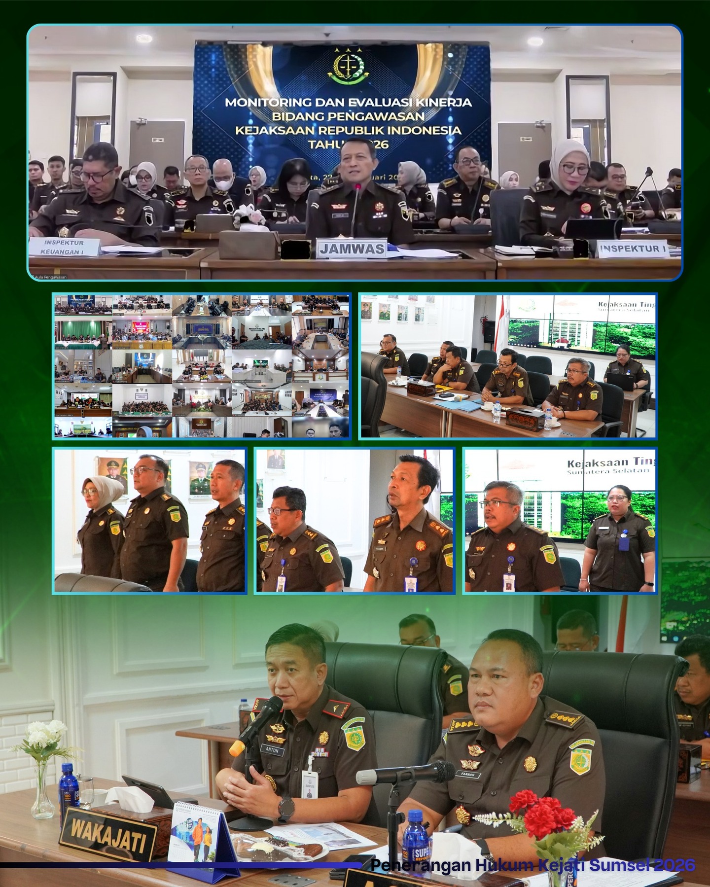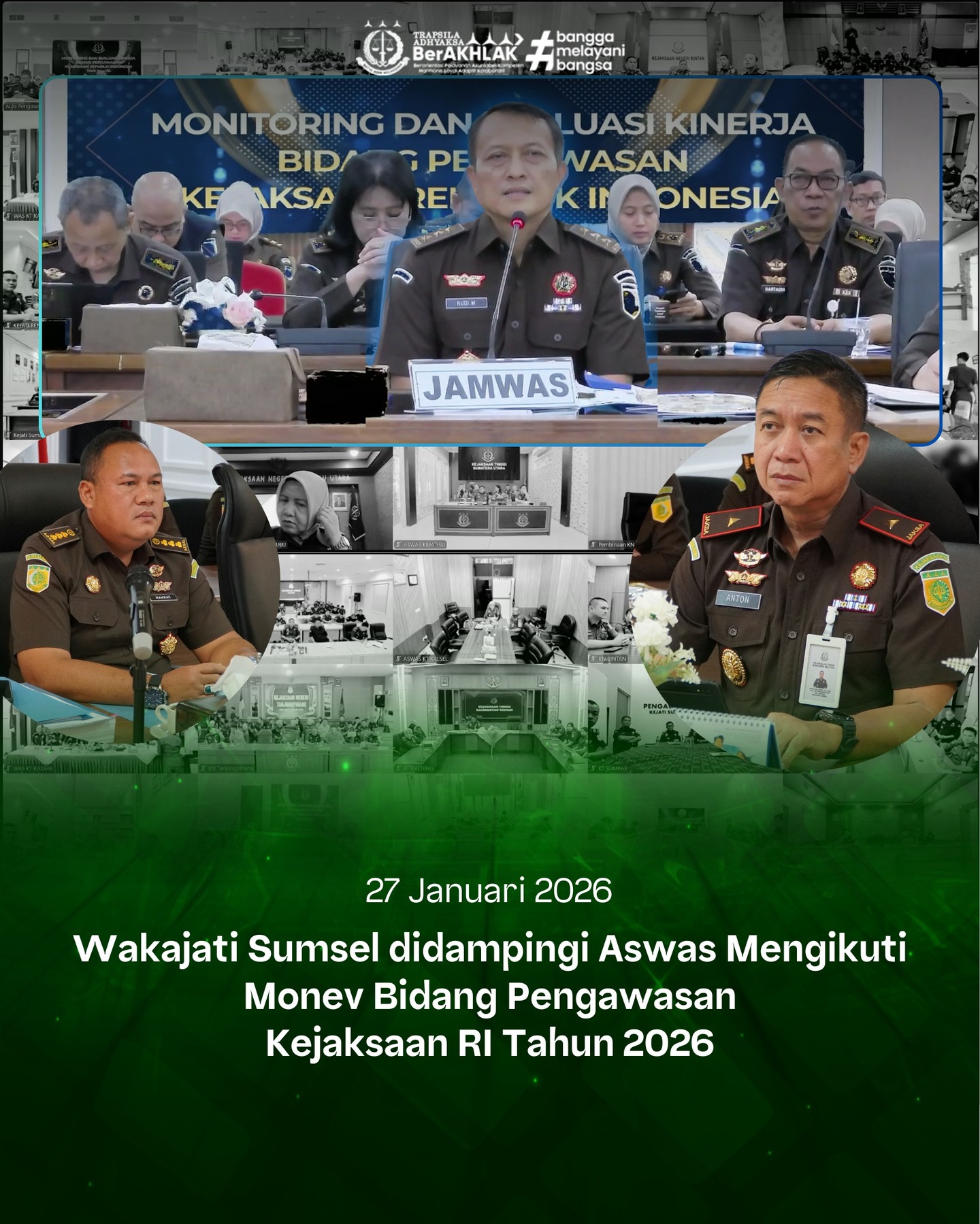 KEJATI SUMSEL - Palembang, Selasa 27 Januari 2026, Wakil Kepala Kejaksaan Tinggi Sumatera Selatan Bapak Anton Delianto, S.H., M.H. didampingi Asisten Bidang Pengawasan Bapak Farhan, S.H., M.H. beserta jajaran pada Bidang Pengawasan Kejaksaan Tinggi Sumatera Selatan mengikuti kegiatan Monitoring dan Evaluasi (Monev) Bidang Pengawasan Kejaksaan Republik Indonesia Tahun 2026 yang diselenggaran oleh Jaksa Agung Muda Bidang Pengawasan Kejaksaan Agung Republik Indonesia dan dipimpin langsung oleh Jaksa Agung Muda Bidang Pengawasan Bapak Dr. Rudi Margono, S.H., M.Hum.