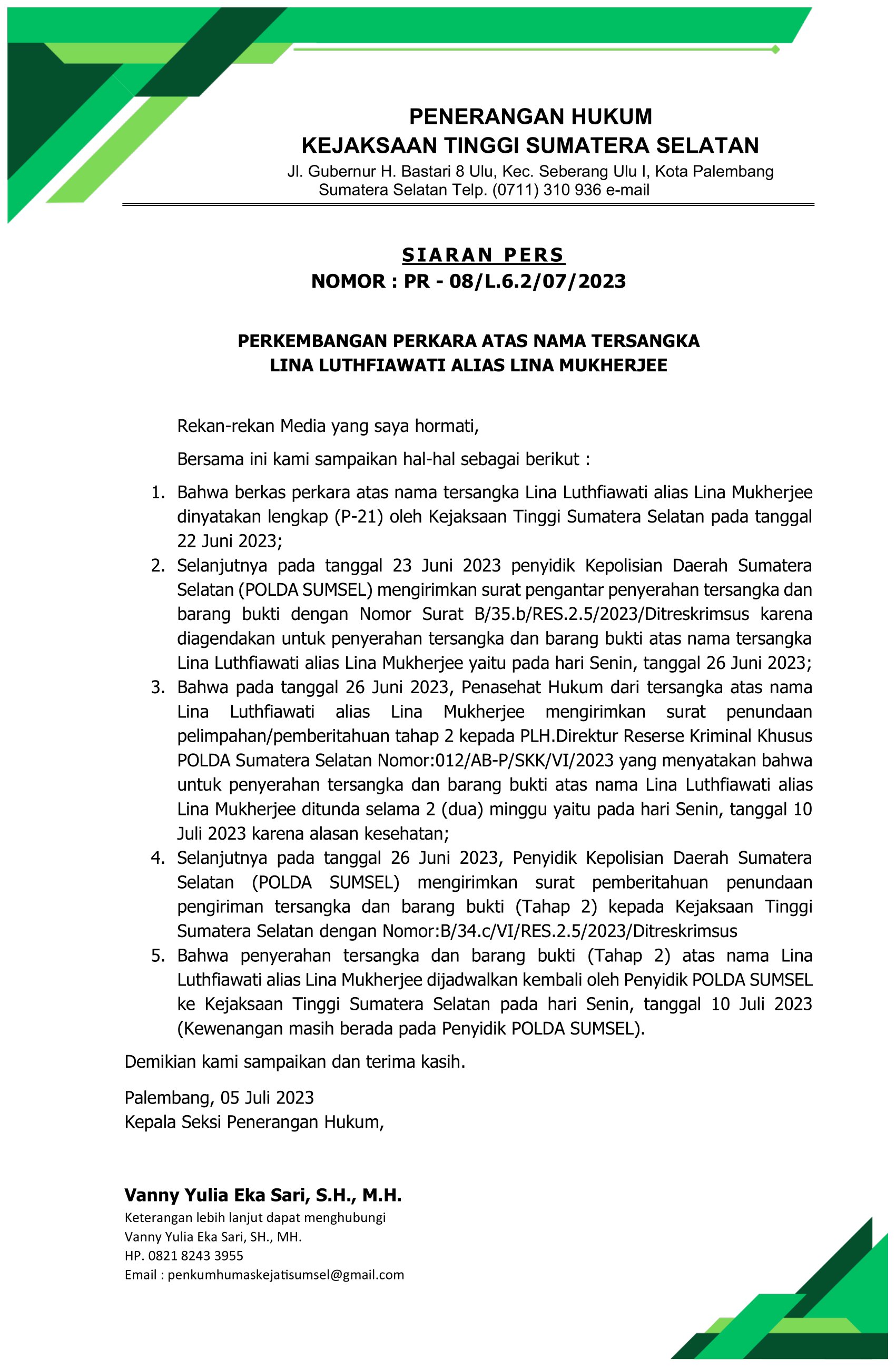 PERKEMBANGAN PERKARA ATAS NAMA TERSANGKA LINA LUTHFIAWATI ALIAS LINA MUKHERJEE