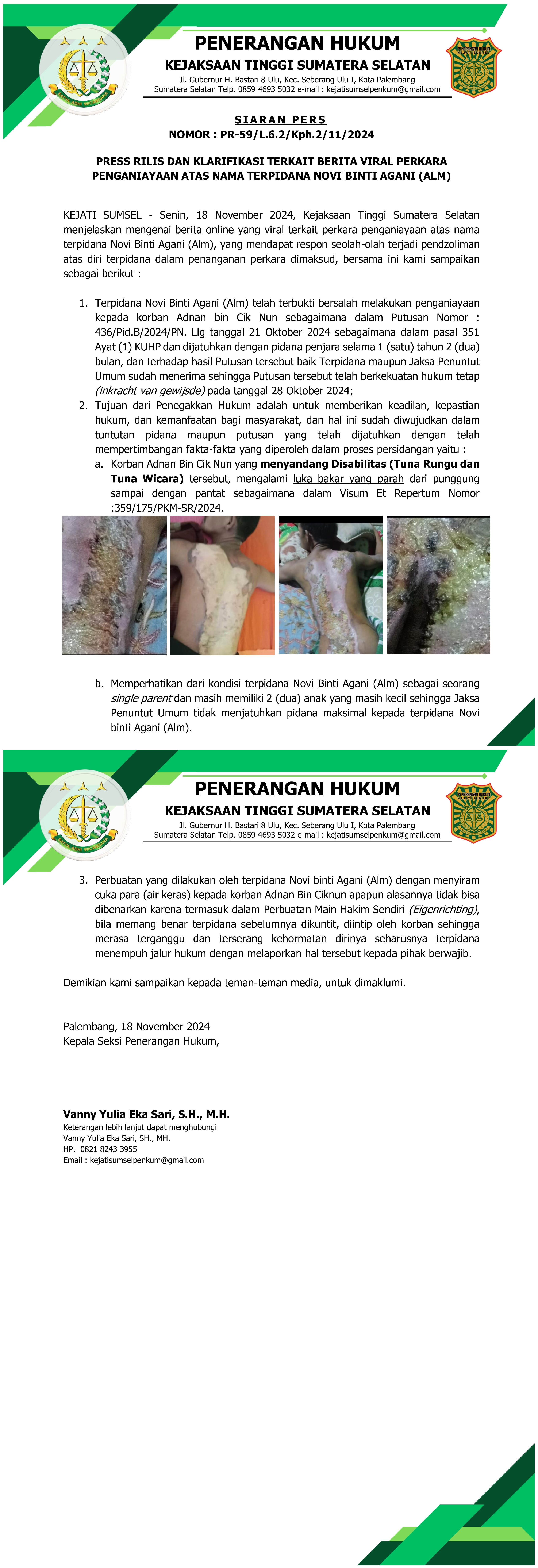 PRESS RILIS DAN KLARIFIKASI TERKAIT BERITA VIRAL PERKARA PENGANIAYAAN ATAS NAMA TERPIDANA NOVI BINTI AGANI (ALM)