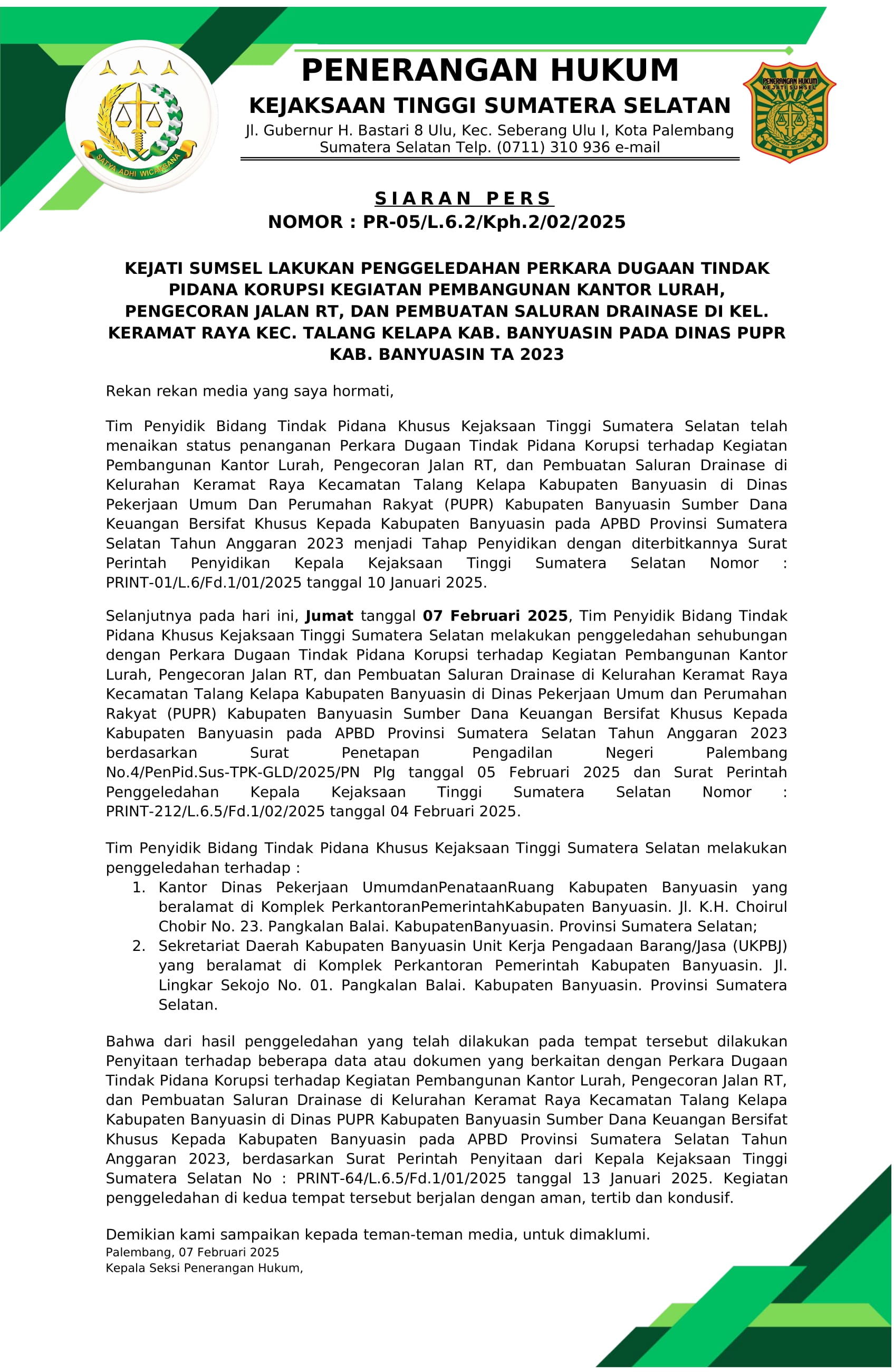 KEJATI SUMSEL LAKUKAN PENGGELEDAHAN PERKARA DUGAAN TINDAK PIDANA KORUPSI KEGIATAN PEMBANGUNAN KANTOR LURAH, PENGECORAN JALAN RT, DAN PEMBUATAN SALURAN DRAINASE DI KEL. KERAMAT RAYA KEC. TALANG KELAPA KAB. BANYUASIN PADA DINAS PUPR KAB. BANYUASIN TA 2023