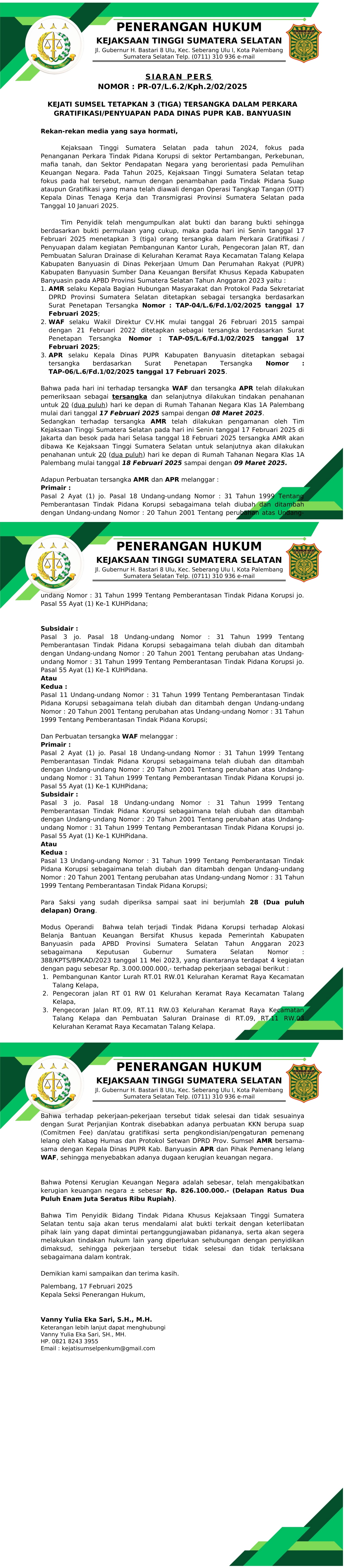 KEJATI SUMSEL TETAPKAN 3 (TIGA) TERSANGKA DALAM PERKARA GRATIFIKASI/PENYUAPAN PADA DINAS PUPR KAB. BANYUASIN
