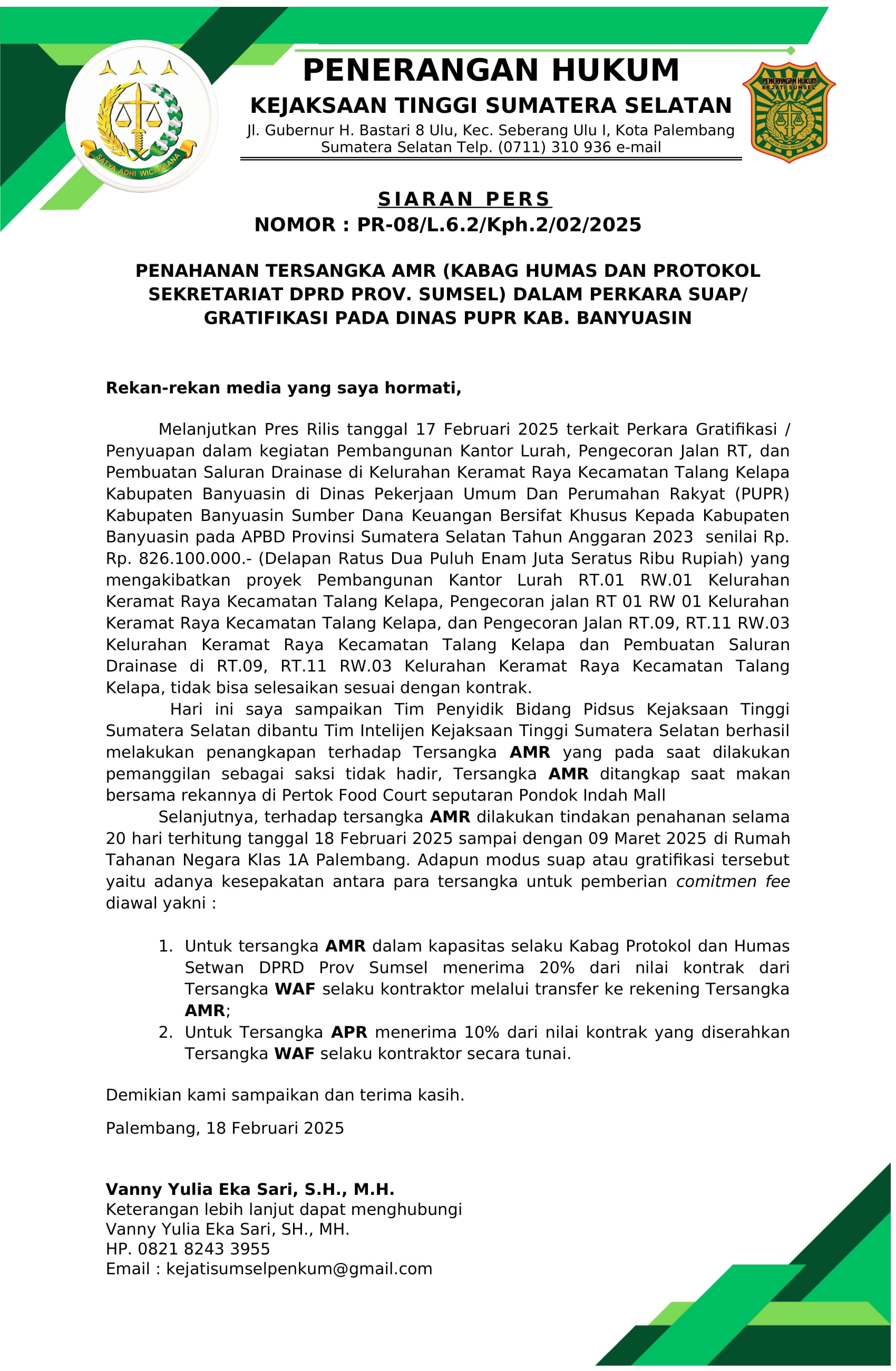 PENAHANAN TERSANGKA AMR (KABAG HUMAS DAN PROTOKOL SEKRETARIAT DPRD PROV. SUMSEL) DALAM PERKARA SUAP/ GRATIFIKASI PADA DINAS PUPR KAB. BANYUASIN