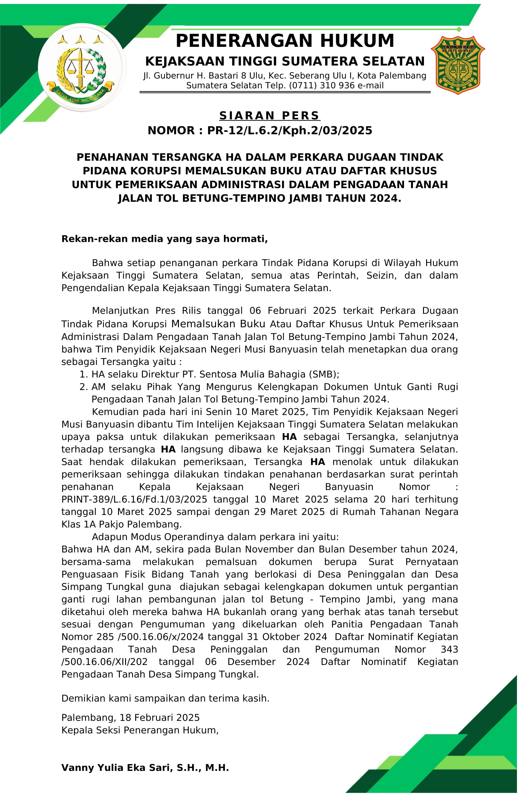 PENAHANAN TERSANGKA HA DALAM PERKARA DUGAAN TINDAK PIDANA KORUPSI MEMALSUKAN BUKU ATAU DAFTAR KHUSUS UNTUK PEMERIKSAAN ADMINISTRASI DALAM PENGADAAN TANAH JALAN TOL BETUNG-TEMPINO JAMBI TAHUN 2024.