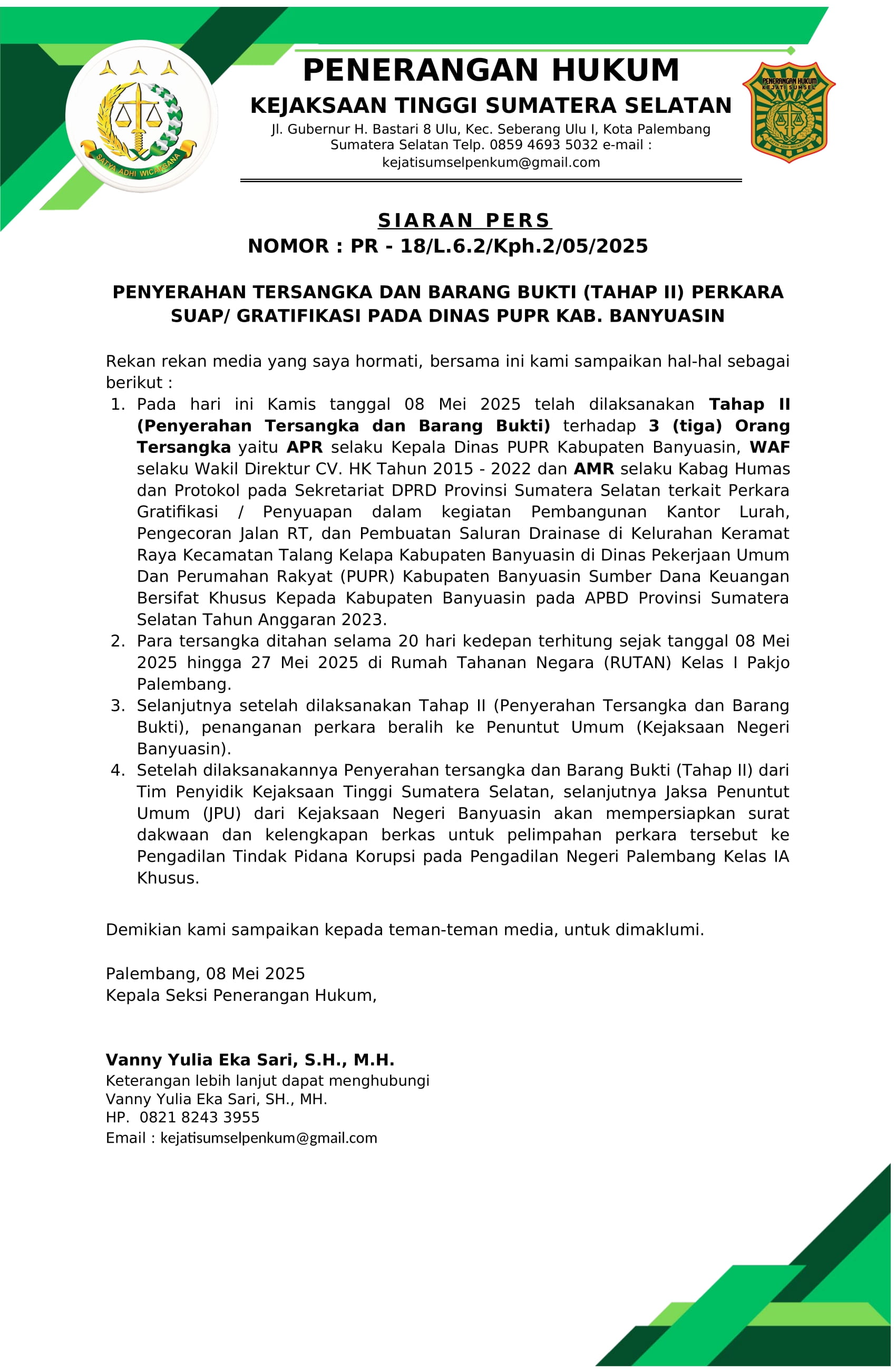 PENYERAHAN TERSANGKA DAN BARANG BUKTI (TAHAP II) PERKARA SUAP/ GRATIFIKASI PADA DINAS PUPR KAB. BANYUASIN