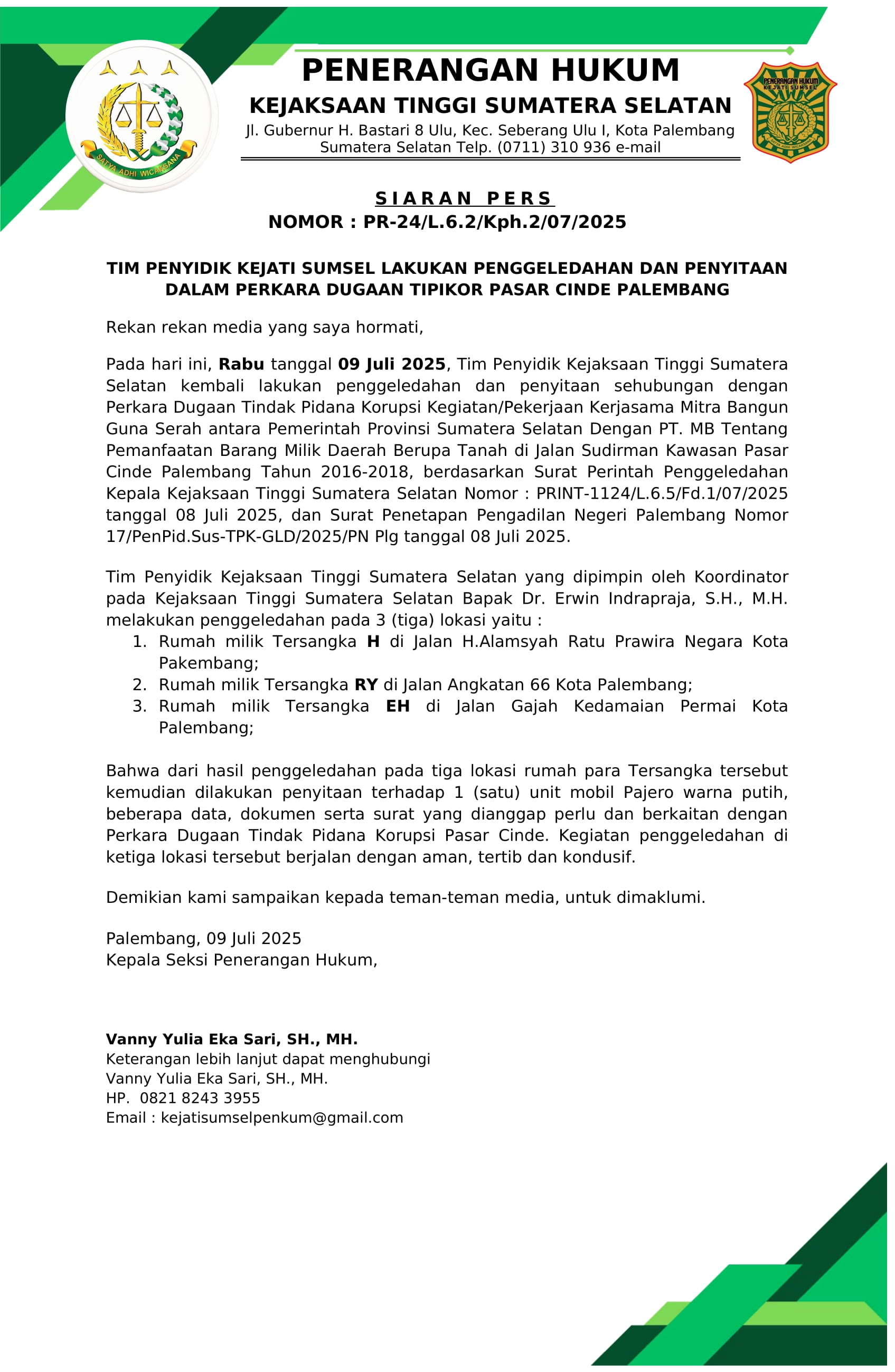 TIM PENYIDIK KEJATI SUMSEL LAKUKAN PENGGELEDAHAN DAN PENYITAAN DALAM PERKARA DUGAAN TIPIKOR PASAR CINDE PALEMBANG
