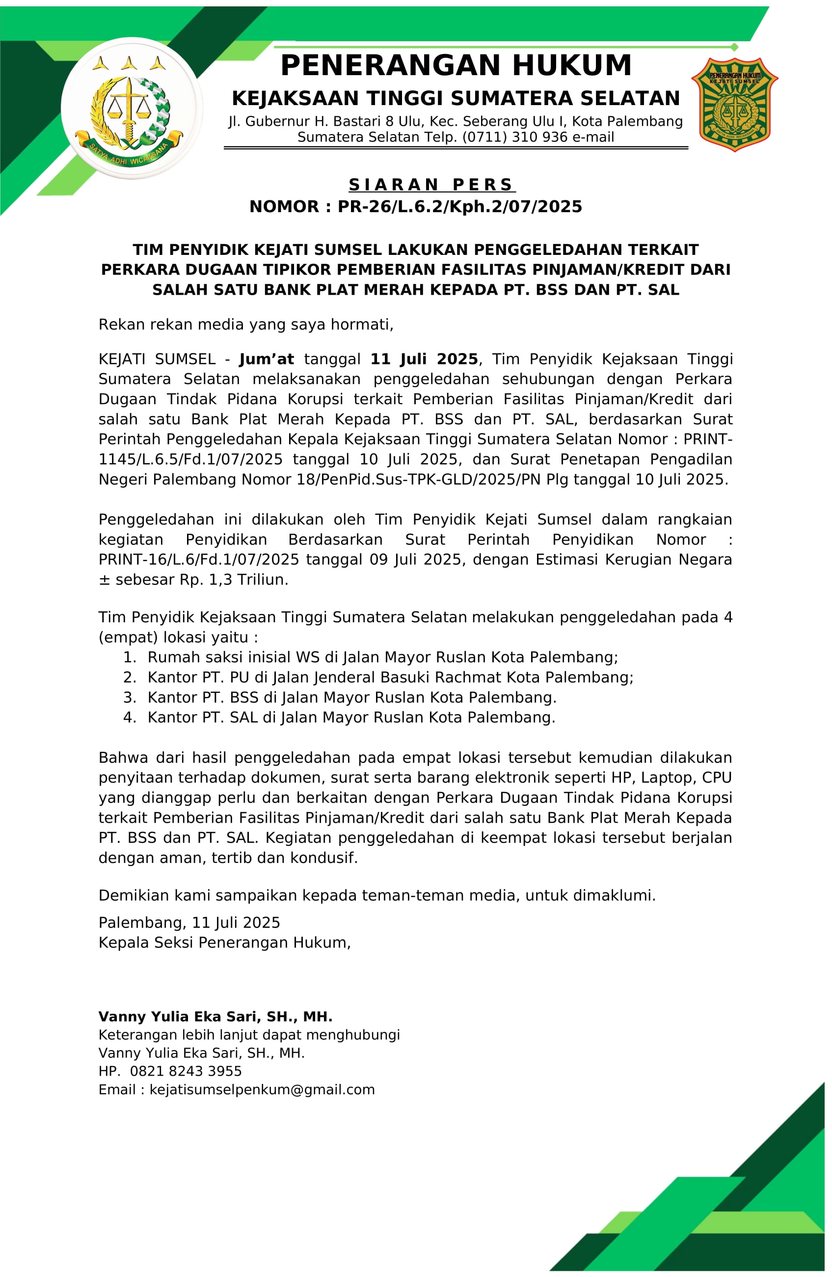 TIM PENYIDIK KEJATI SUMSEL LAKUKAN PENGGELEDAHAN TERKAIT PERKARA DUGAAN TIPIKOR PEMBERIAN FASILITAS PINJAMAN/KREDIT DARI SALAH SATU BANK PLAT MERAH KEPADA PT. BSS DAN PT. SAL