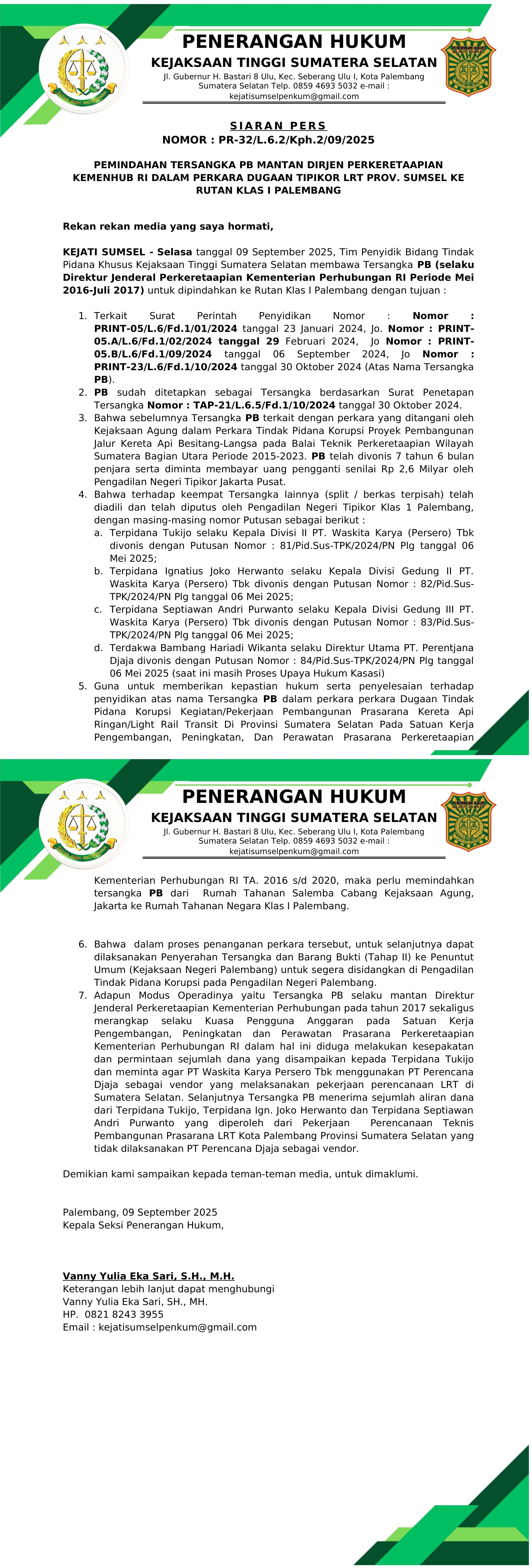 PEMINDAHAN TERSANGKA PB MANTAN DIRJEN PERKERETAAPIAN KEMENHUB RI DALAM PERKARA DUGAAN TIPIKOR LRT PROV. SUMSEL KE RUTAN KLAS I PALEMBANG
