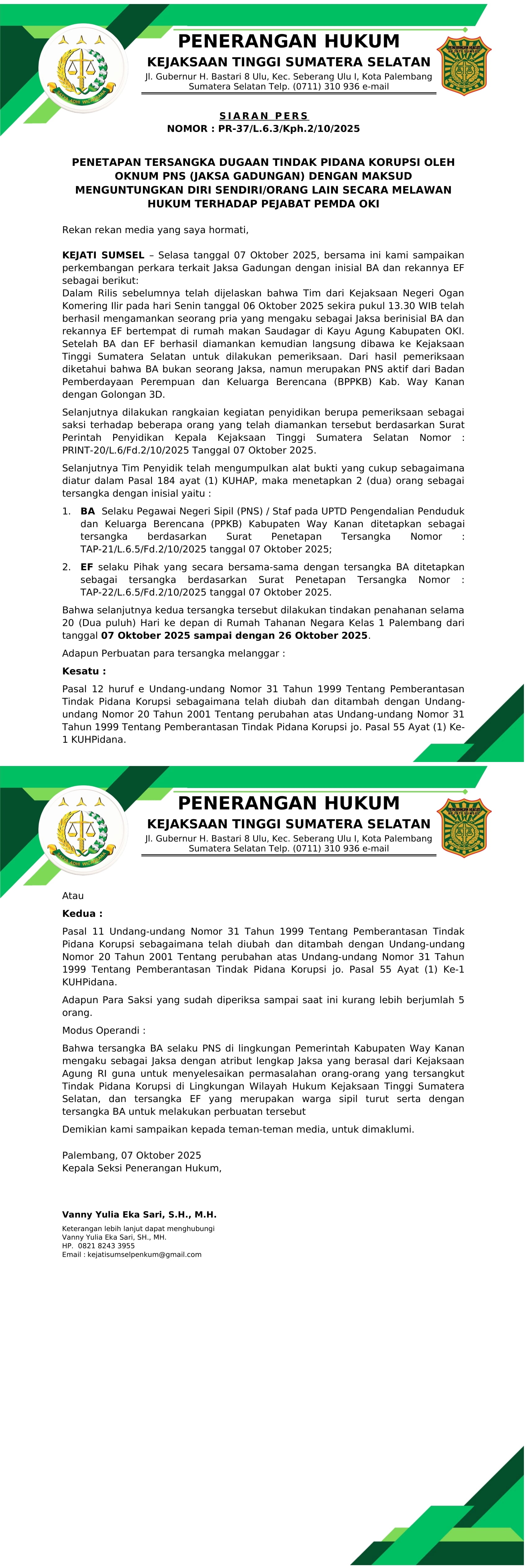 PENETAPAN TERSANGKA DUGAAN TINDAK PIDANA KORUPSI OLEH OKNUM PNS (JAKSA GADUNGAN) DENGAN MAKSUD MENGUNTUNGKAN DIRI SENDIRI/ORANG LAIN SECARA MELAWAN HUKUM TERHADAP PEJABAT PEMDA OKI