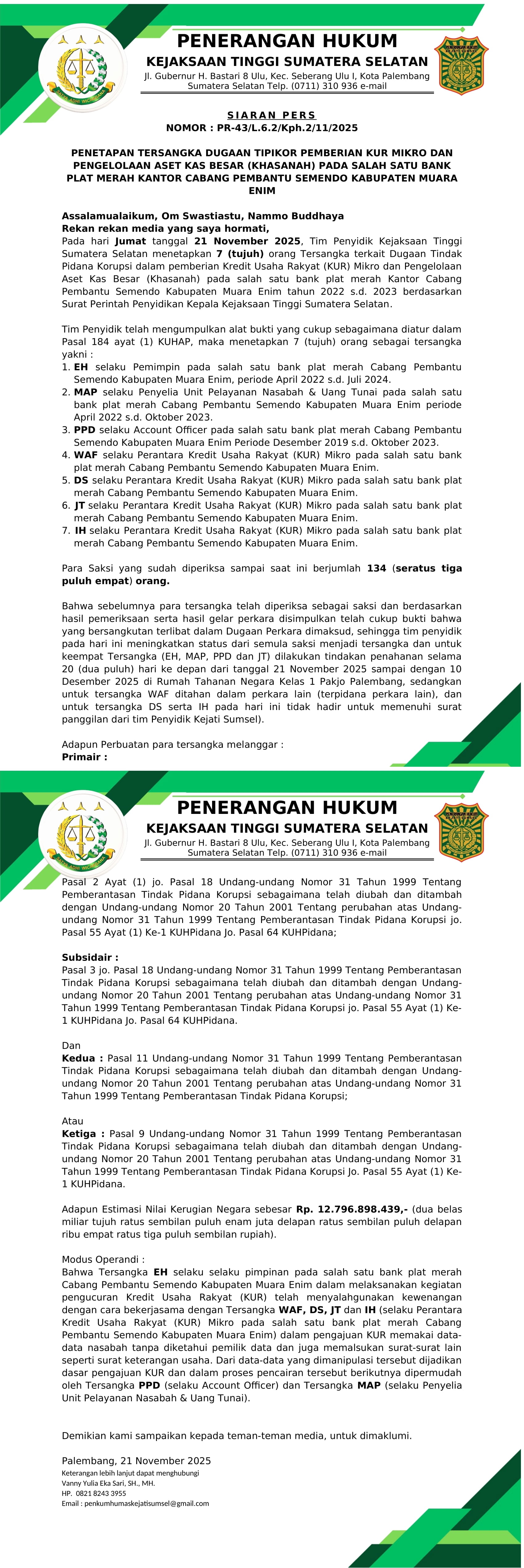 PENETAPAN TERSANGKA DUGAAN TIPIKOR PEMBERIAN KUR MIKRO DAN PENGELOLAAN ASET KAS BESAR (KHASANAH) PADA SALAH SATU BANK PLAT MERAH KANTOR CABANG PEMBANTU SEMENDO KABUPATEN MUARA ENIM